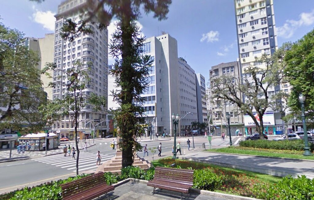 Ao centro da imagem, destaca-se o recém-inaugurado edifício da Biblioteca Pública do Paraná. À esquerda, identifica-se parte do edifício Eduardo VII e, à direita, o edifício Tiradentes. Todas essas edificações ainda existem atualmente, conforme pode ser observado na imagem comparativa.