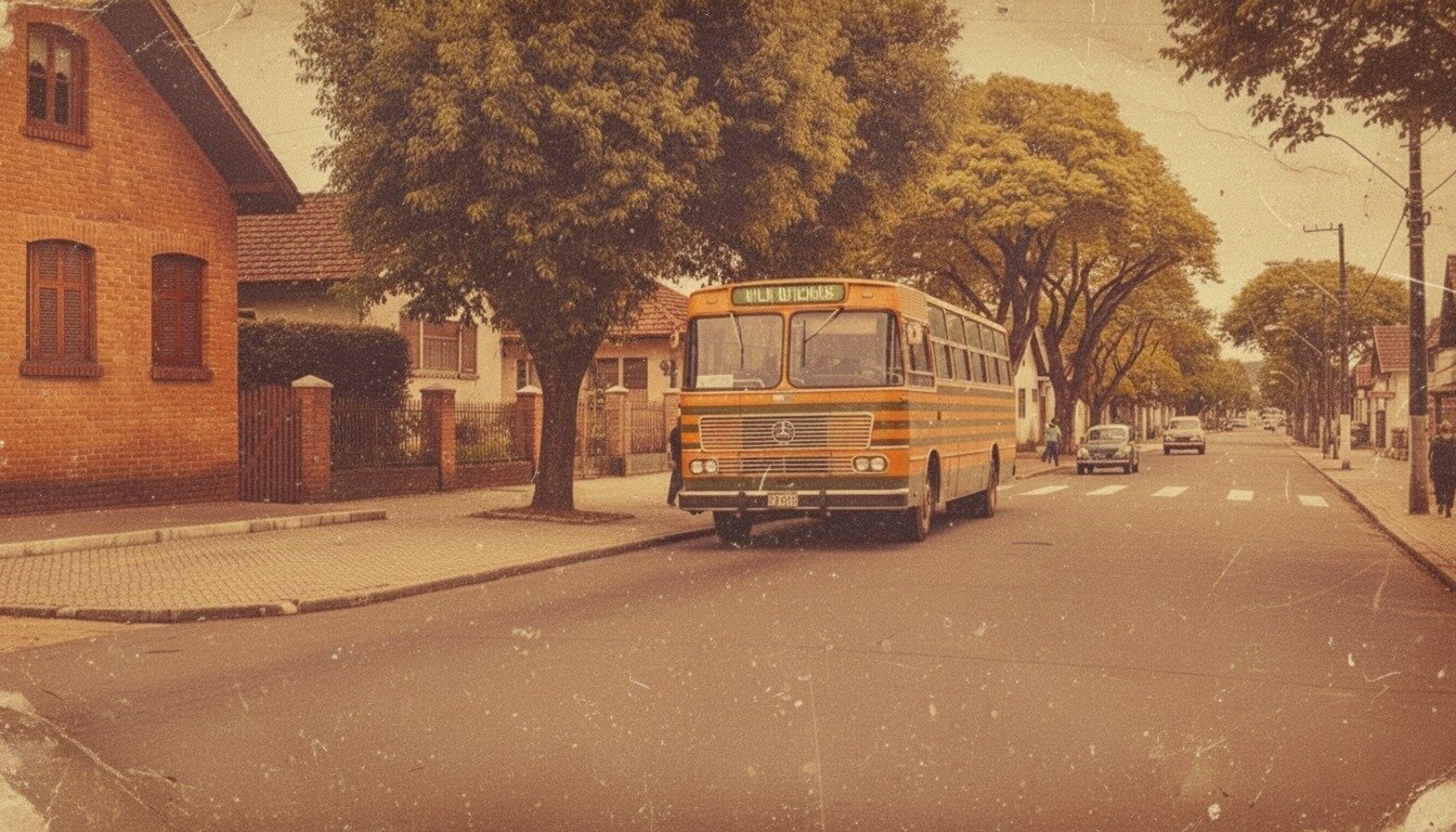 Nesta fotografia da década de 1970, vemos um ônibus da linha Vila Oficinas em circulação pelo bairro do Cajuru.