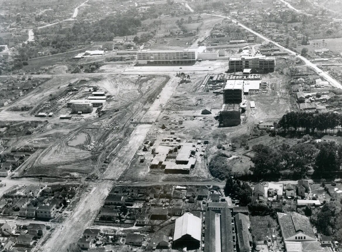 Nesta fotografia da década de 1950, registrada por Synval Stocchero, observa-se uma imagem aérea da região do Centro Cívico durante sua construção.
