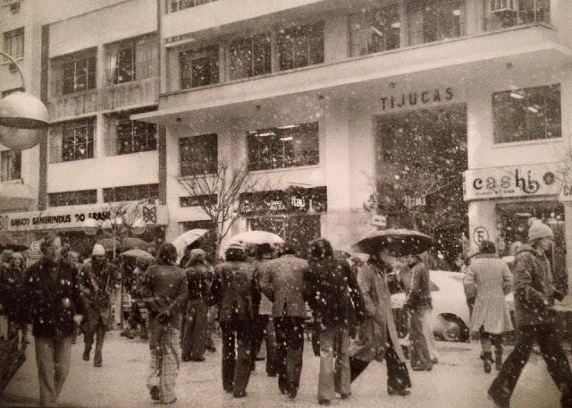 Nesta fotografia de 1975, vemos um belo registro da neve que caiu na cidade de Curitiba no dia 17 de julho daquele ano, a partir do ângulo da avenida Luiz Xavier.