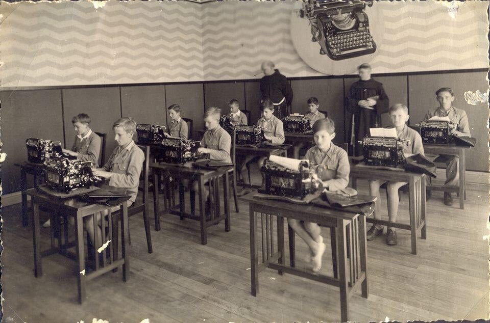 Nesta fotografia, provavelmente da segunda metade da década de 1920, podemos observar um dos conteúdos ensinados pelos frades aos alunos da instituição: a datilografia.
